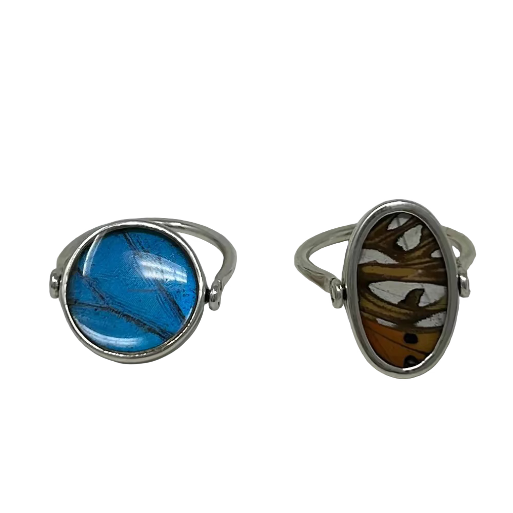Two sided sterling silver heart, round, or oval shaped butterfly wing ring. The band swivels so you can choose which side to show.