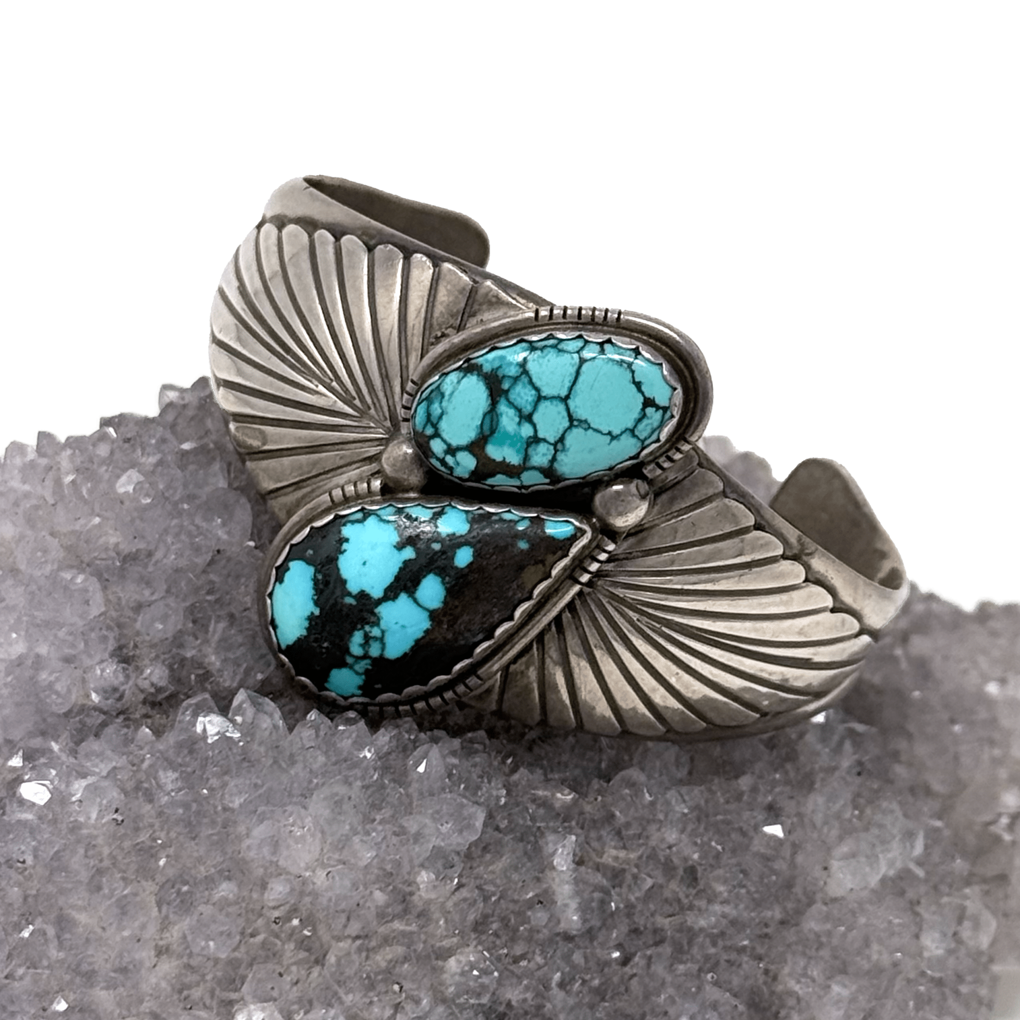 Two Nepal Turquoise stones set in a carved sterling silver cuff. Very unusual piece with beautiful lines and high quality stones.