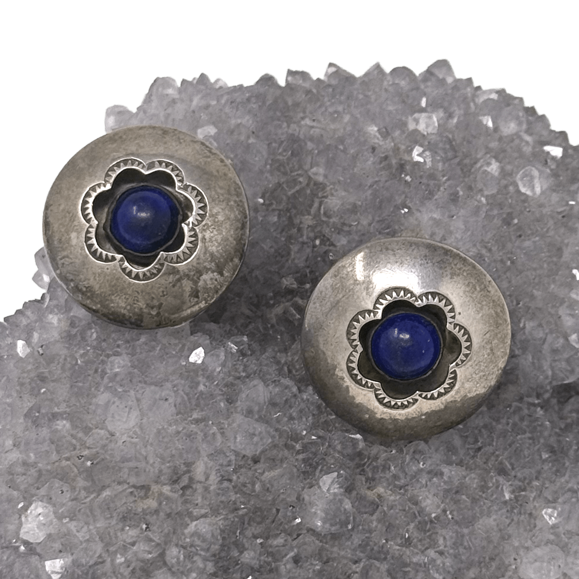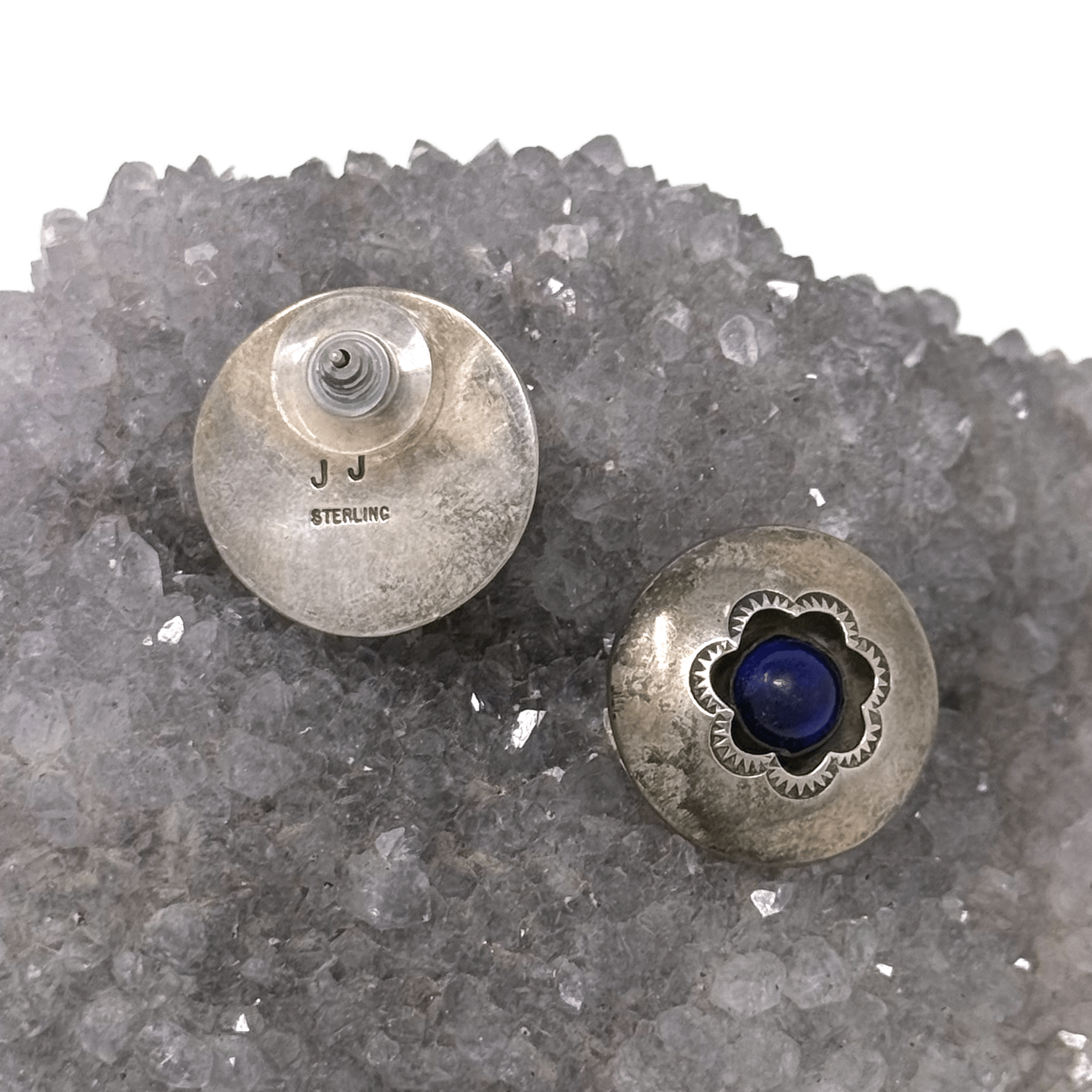Beautiful shadowbox earrings with carved floral detail featuring round lapis stones. Sterling silver stud earrings with "JJ" makers mark on back.