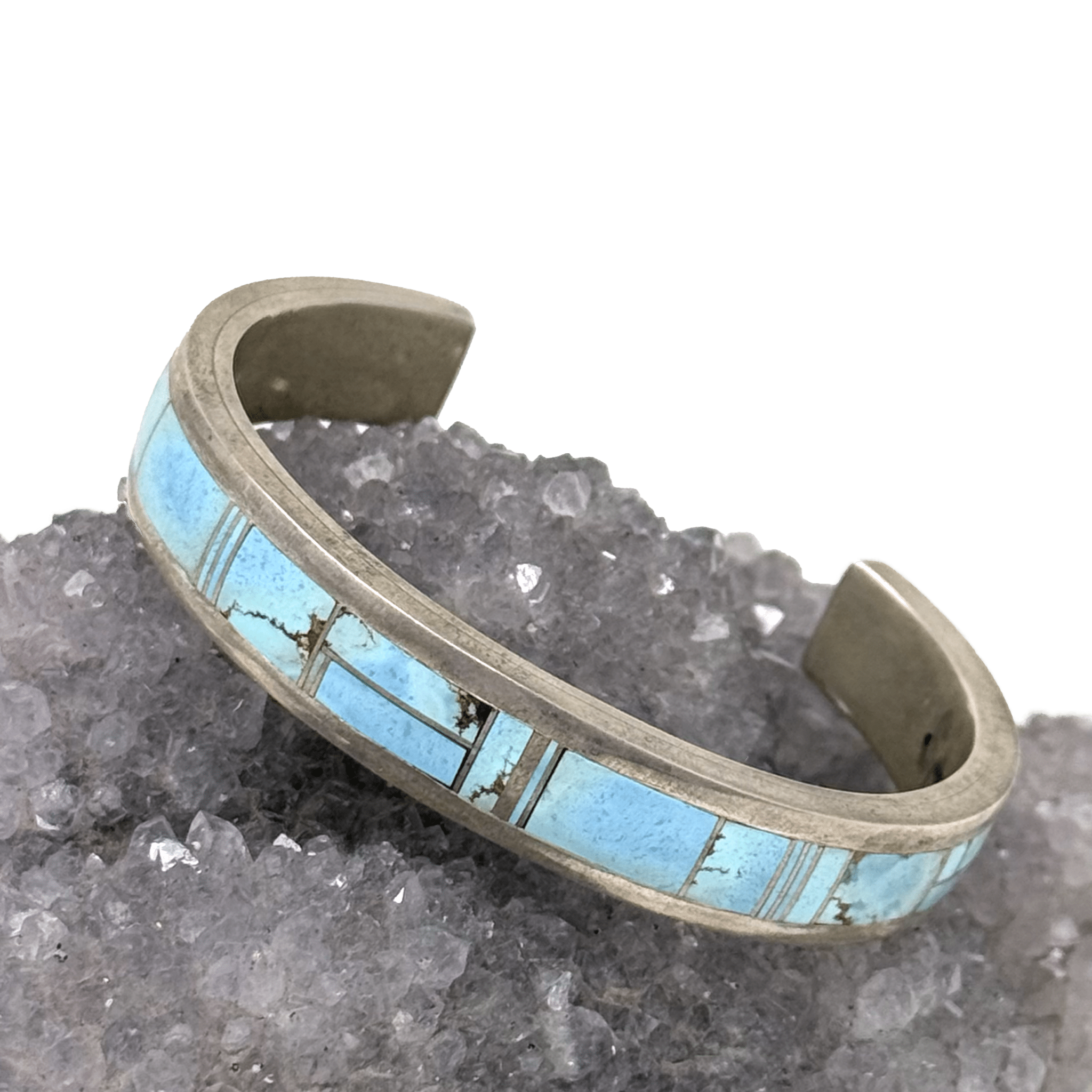 Sterling silver cuff with rectangular turquoise inlays. Made by artist Thomas Francisco. 6 cm cuff, 3.5 cm opening, 1.25 cm tall.