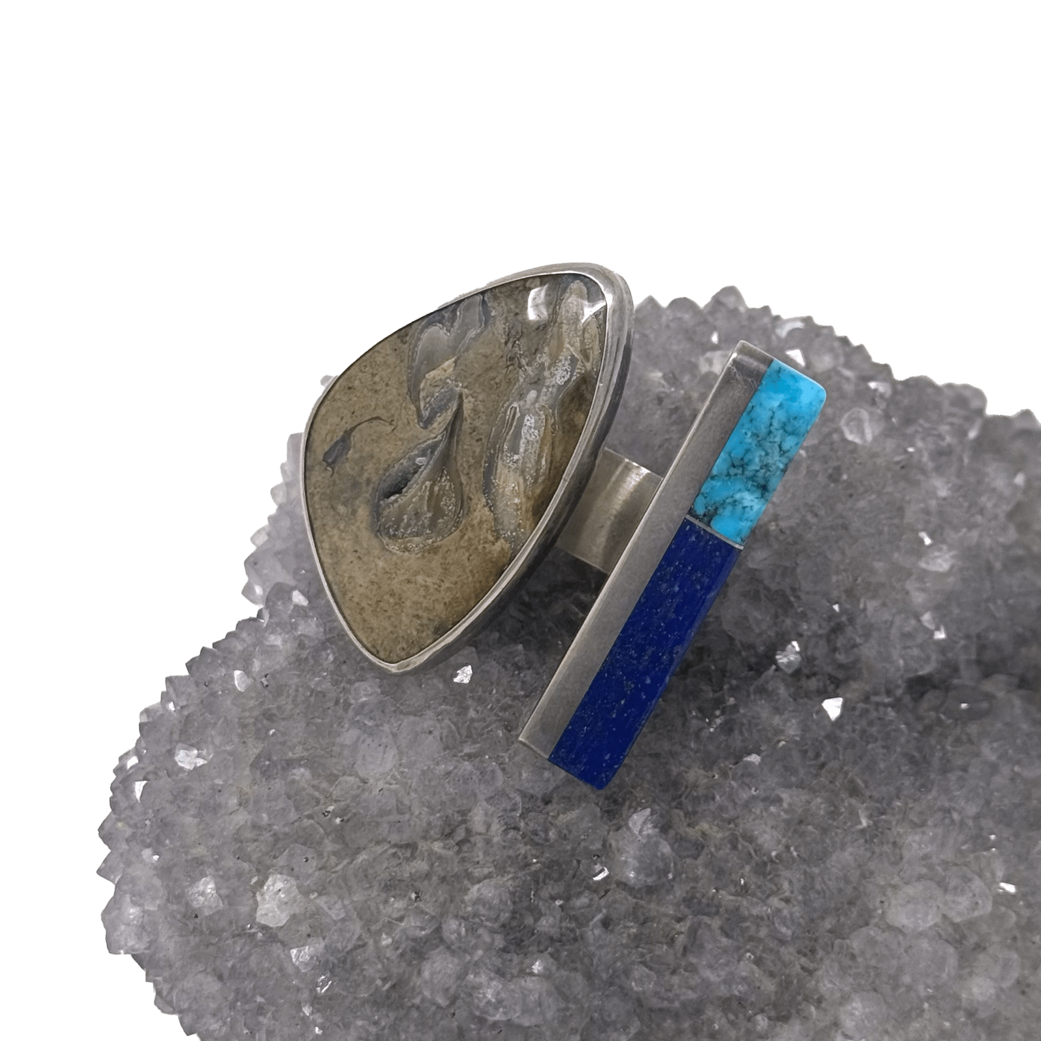 Silver setting with very large sandy crystal on one end of the band, turquoise and lapis lazuli inlayed on alternate end. Stones meet but the band remains open, unclosed. While a stunning large statement piece, the stones rest between your fingers and do not carry the same weight as a ring of the same size with a center stone.