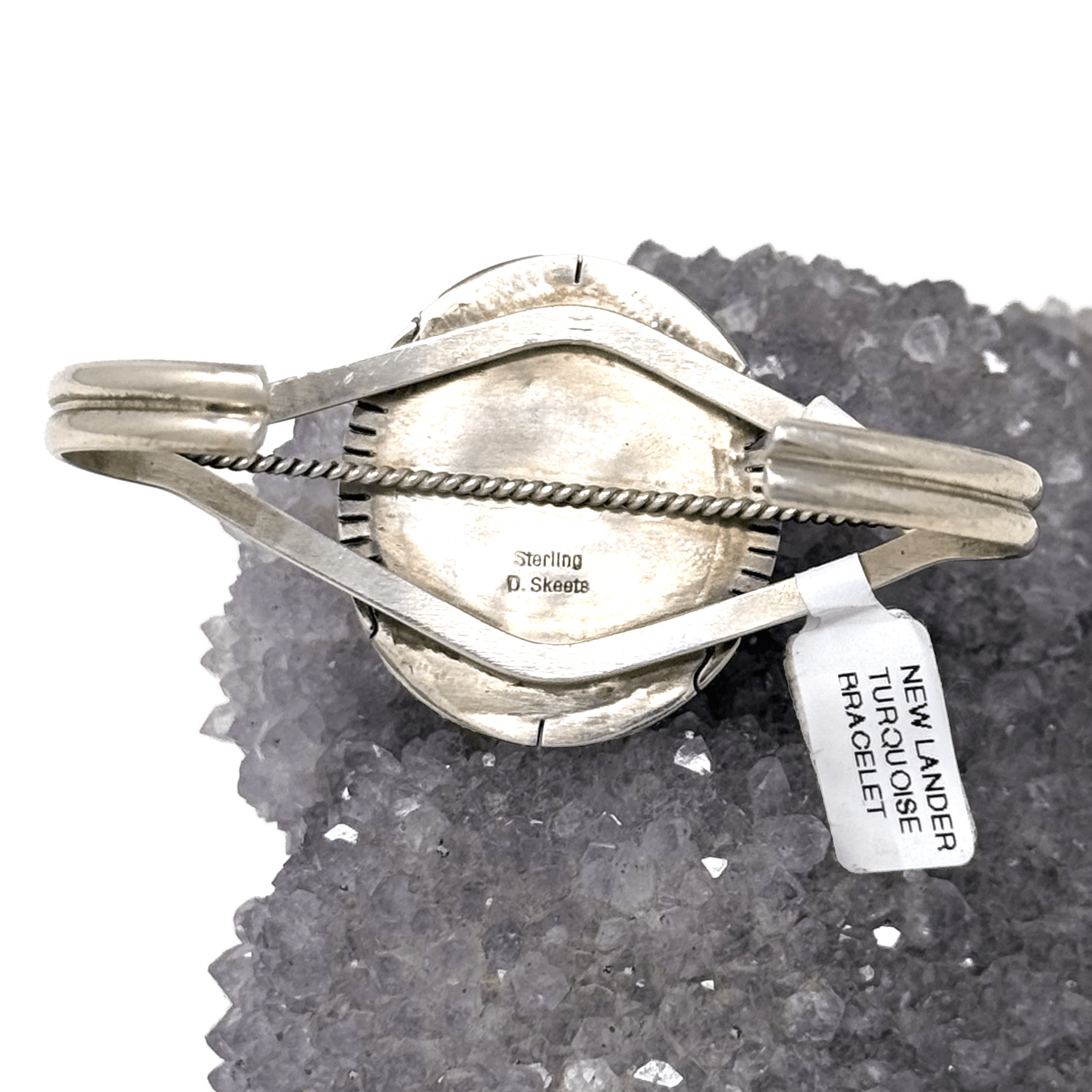 Navajo handmade bracelet by Dave Skeets with a round New Lander Turquoise stone in classic sterling silver setting.