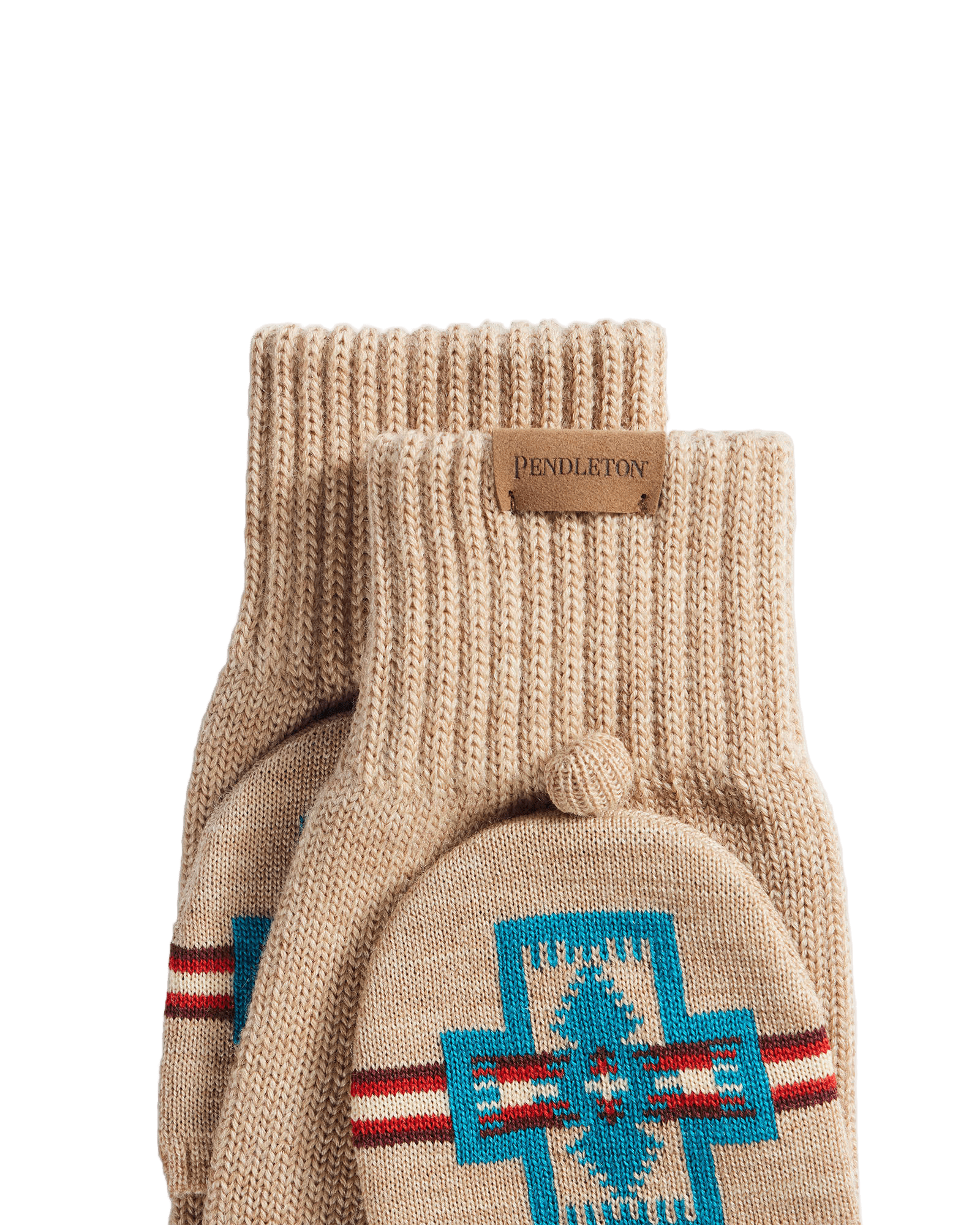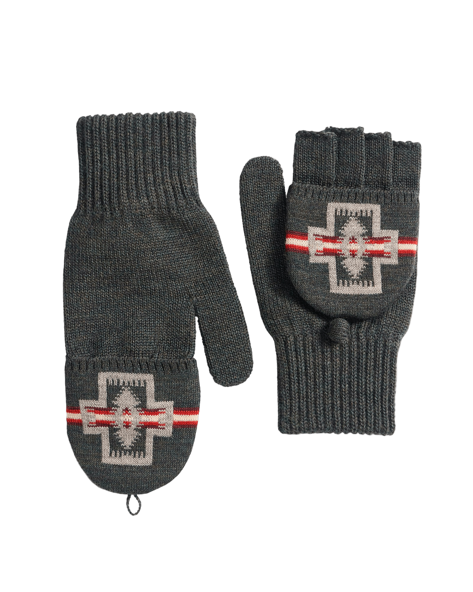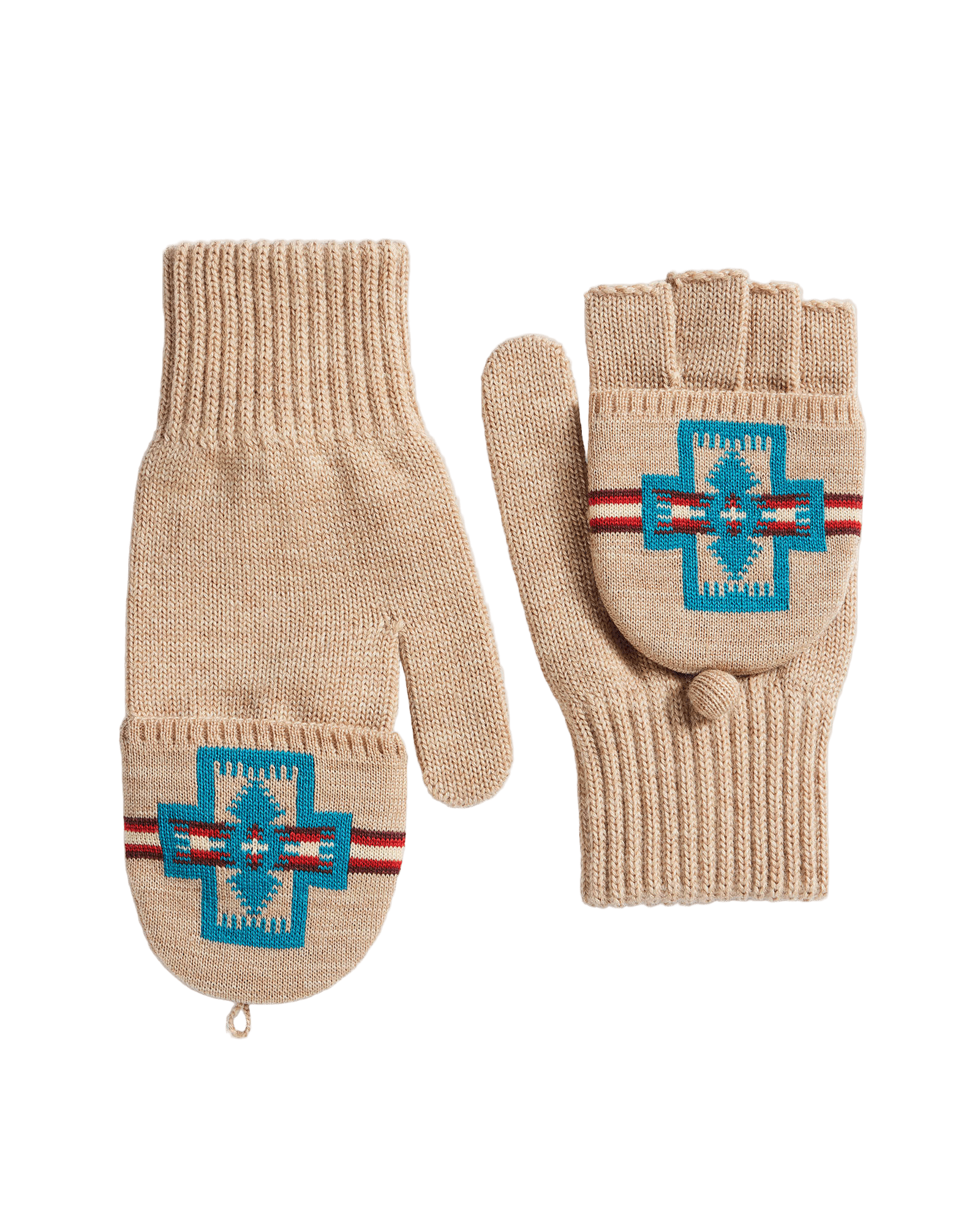 These versatile mittens convert to fingerless gloves, offering the warmth of a mitten with the dexterity of exposed fingers. A convenient thread loop secures the cap for ease of wear. Knit from a soft, stretchy blend with our iconic Harding pattern in bright accent colors, these fingerless gloves are ideal for texting on cold days or layering for outdoor adventures. The long, rib-knit cuff helps keep you warm and is finished with a leather Pendleton patch at the wrist.