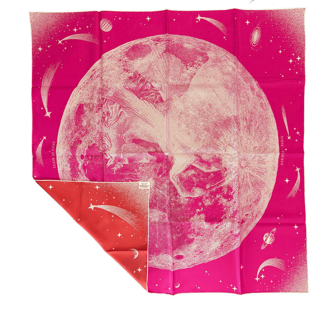 The Hermes Double face, "Clair de Lune" silk scarf with hand-rolled edges is two beautiful scarves in one. The two-sided design by artist Dimitri Rybaltchenko is a show stopper. As though revealing the hidden face of the Moon, the scarf is divided between shadow and light. A crescent showered in stars borders a wide disk upon which the powerful body of the winged horse, Pegasus, appears - a divine creature with a disheveled mane. Dimitri Rybaltchenko creates a symbolic image, traced on the moon's surface, with tiny geometrical detailing whose forms evoke a secret code.