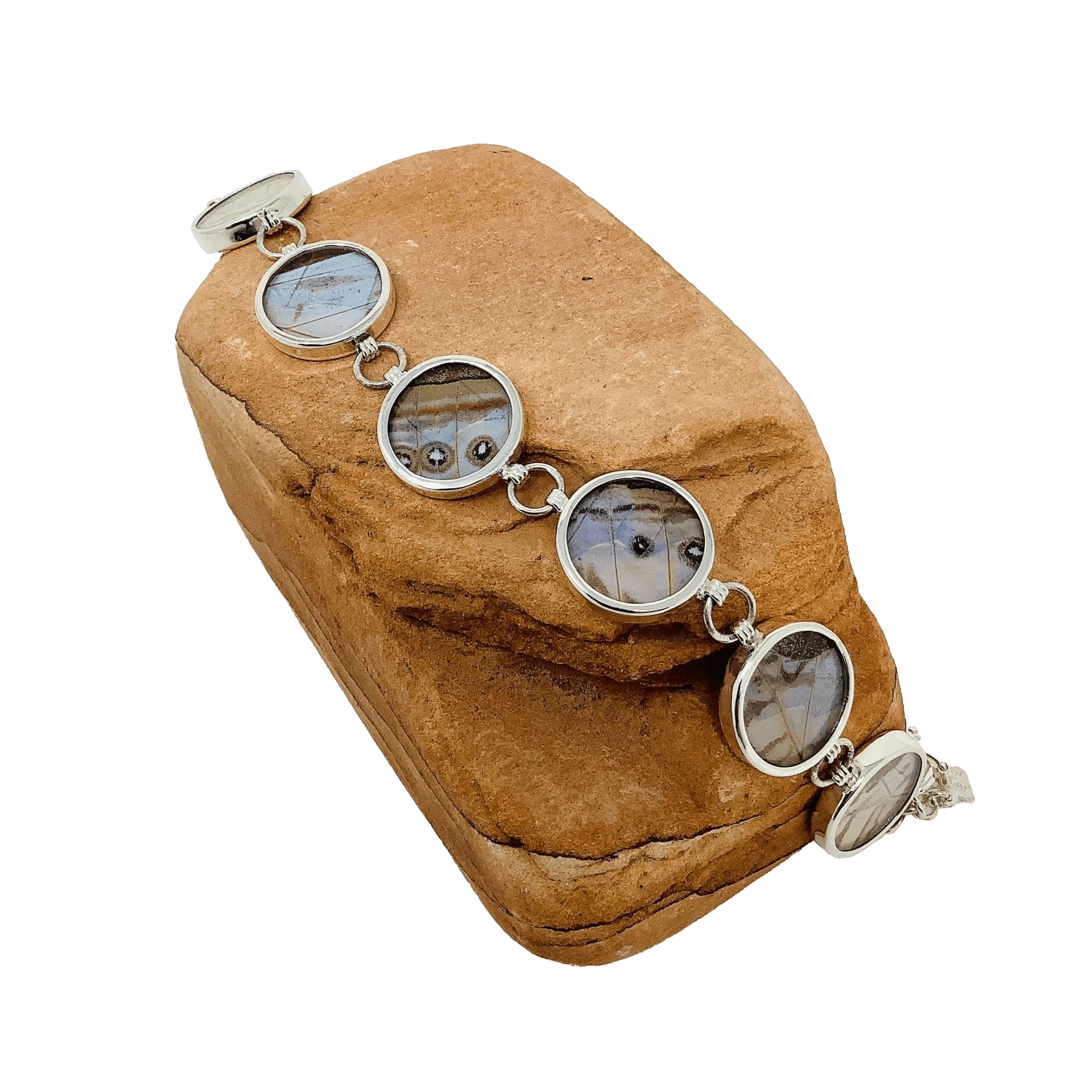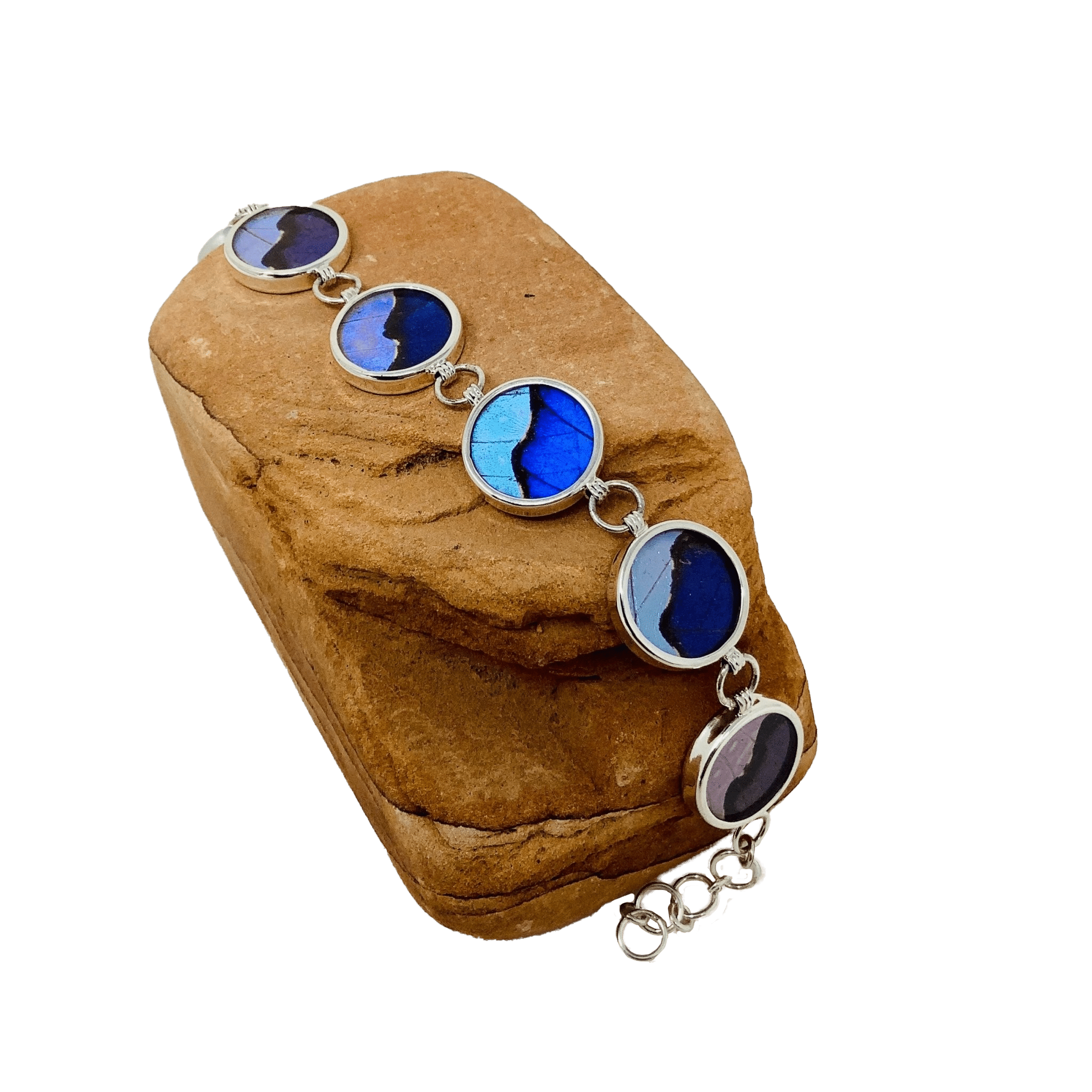 Made from real butterfly wings from the Peruvian Amazon where native people collect the wings once the butterflies have completed their life cycle. The wings are coated in resin and set in sterling silver to create a long-lasting and waterproof piece. Butterflies symbolize the cycle of life, rebirth, freedom, and love. Let these wings inspire you. Bracelet is double sided, with different colored wings on each side. The colors of the wings vary