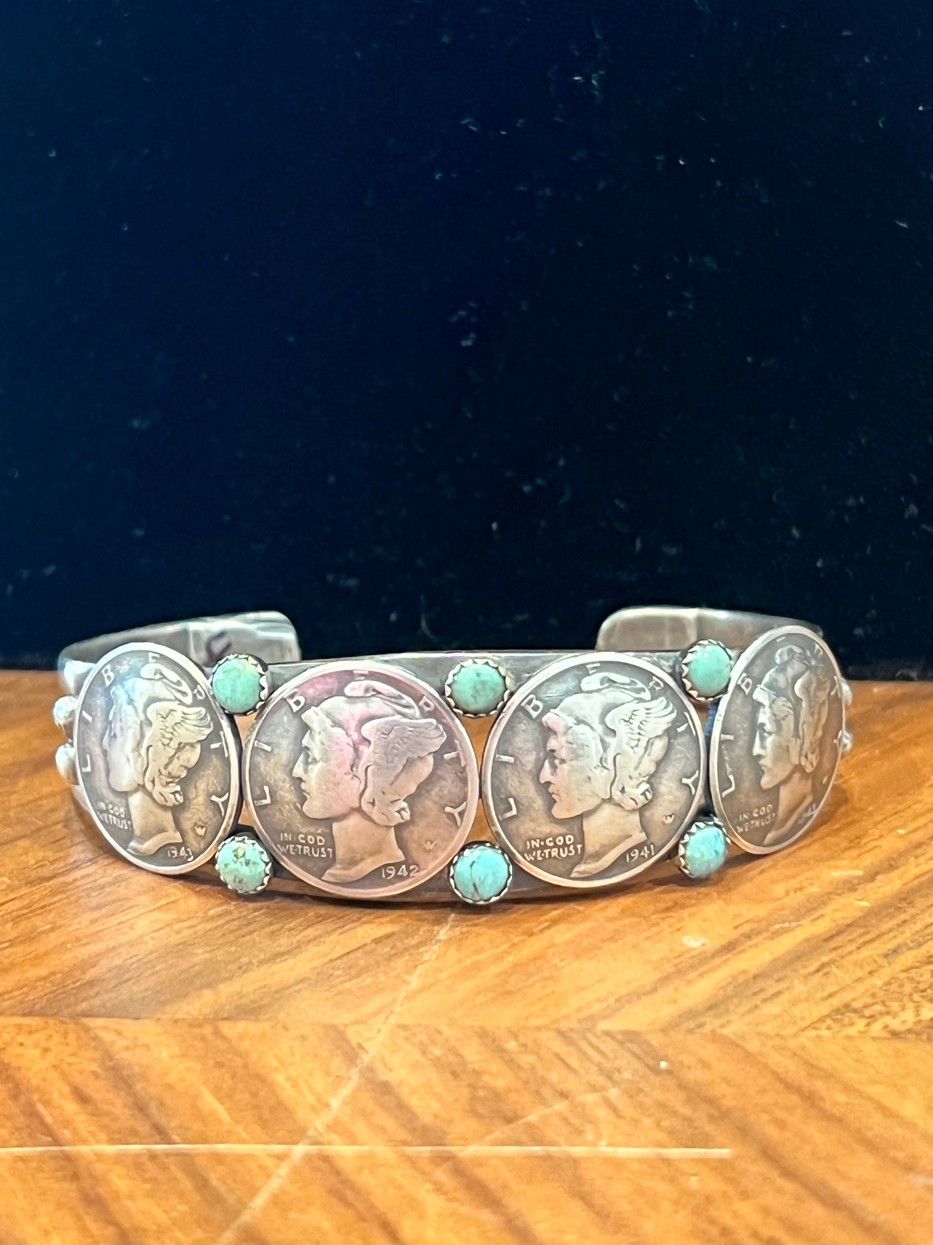 Buffalo Dancer artisans, sterling bracelet featuring Coins with small turquoise accent beads.