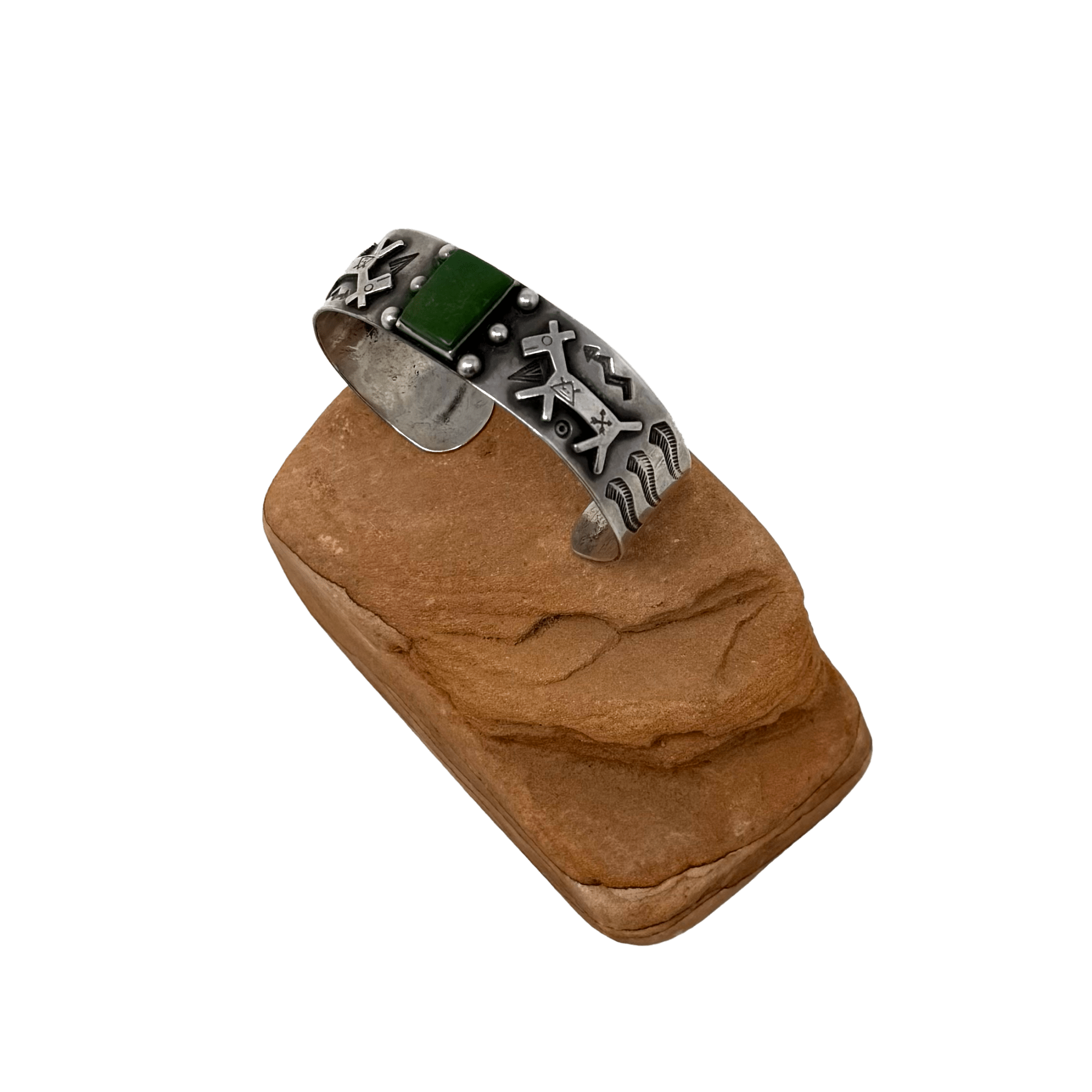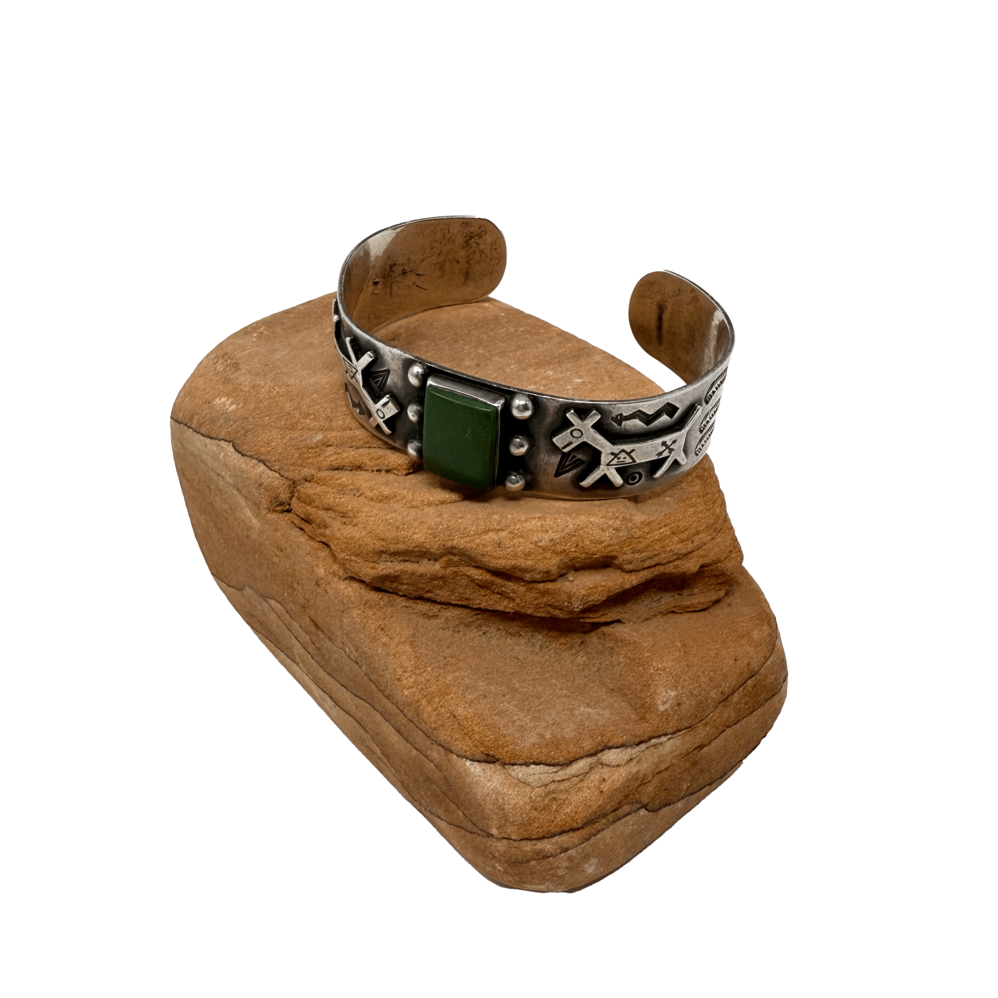 Fred Harvey era silver cuff with hand-stamped horse designs, set with a fascinating green-colored turquoise stone.