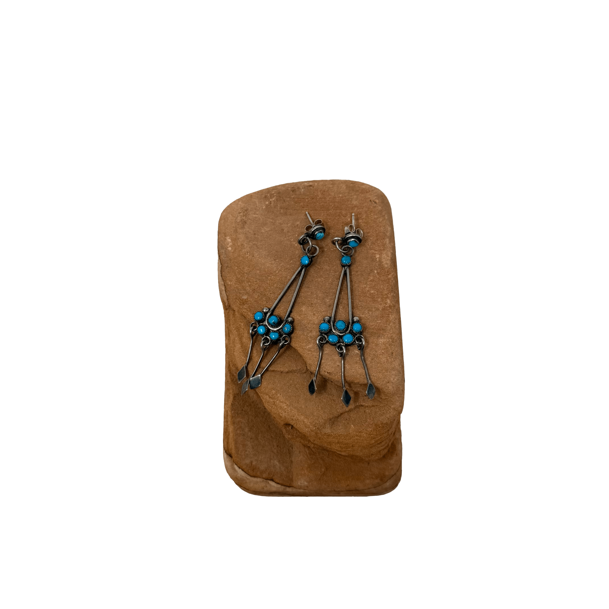 Petite teardrop shaped earrings set with turquoise, with turquoise at the earring post and silver dangles that glint and glimmer in the light.