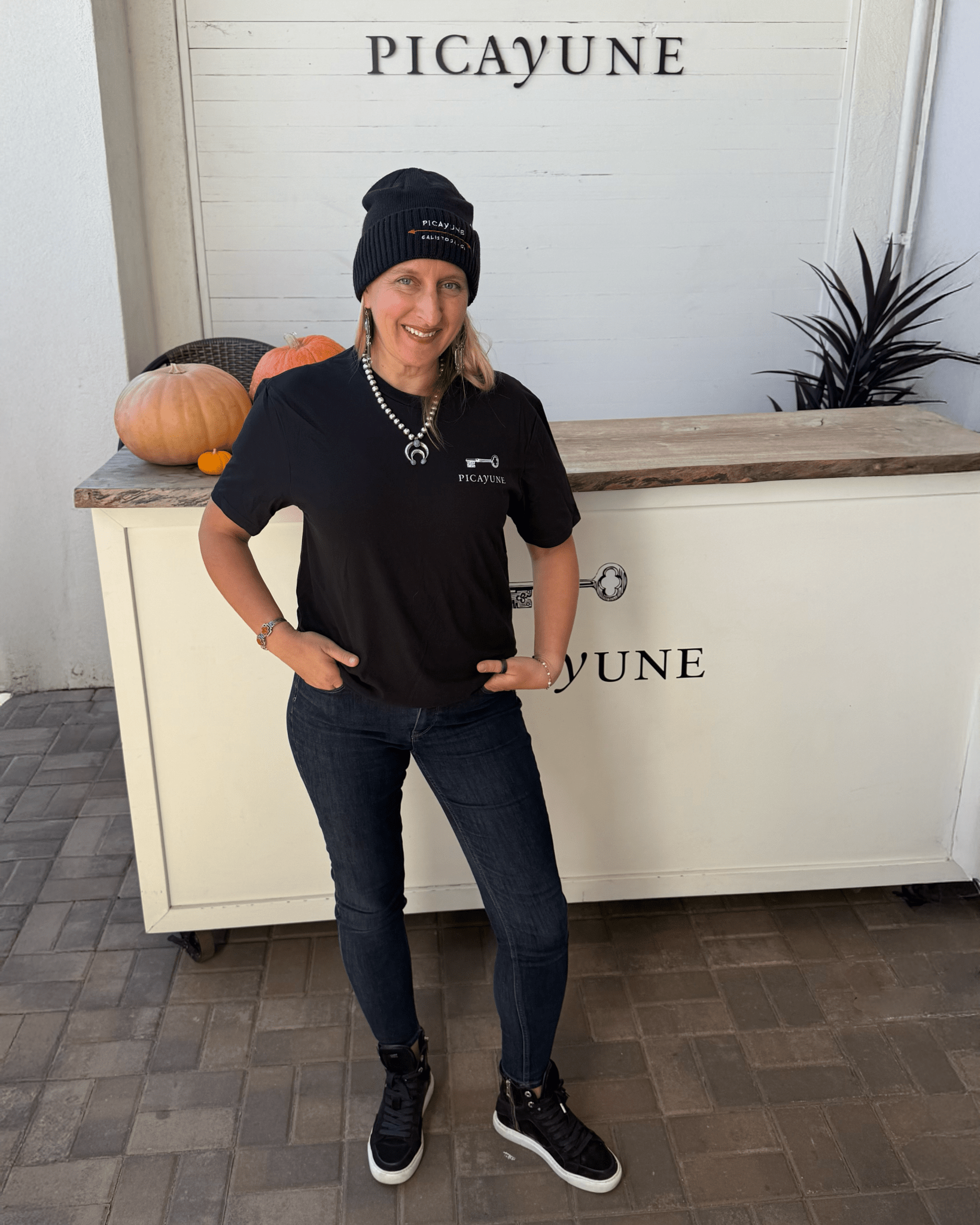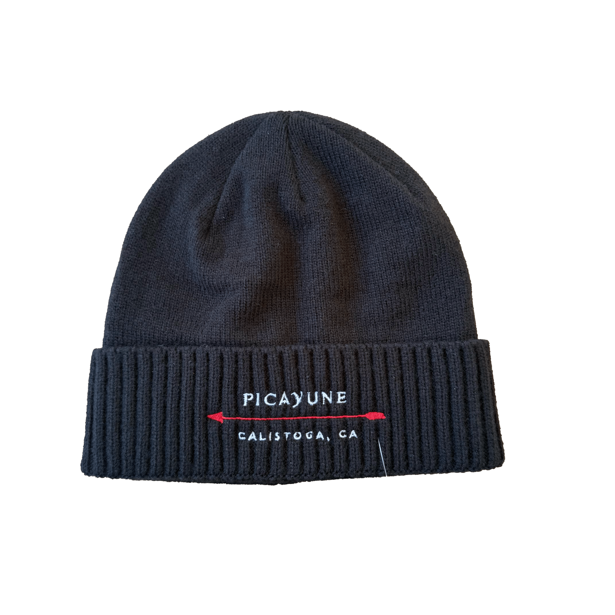 Black knit cap featuring the iconic Calistoga arrow and Picayune!