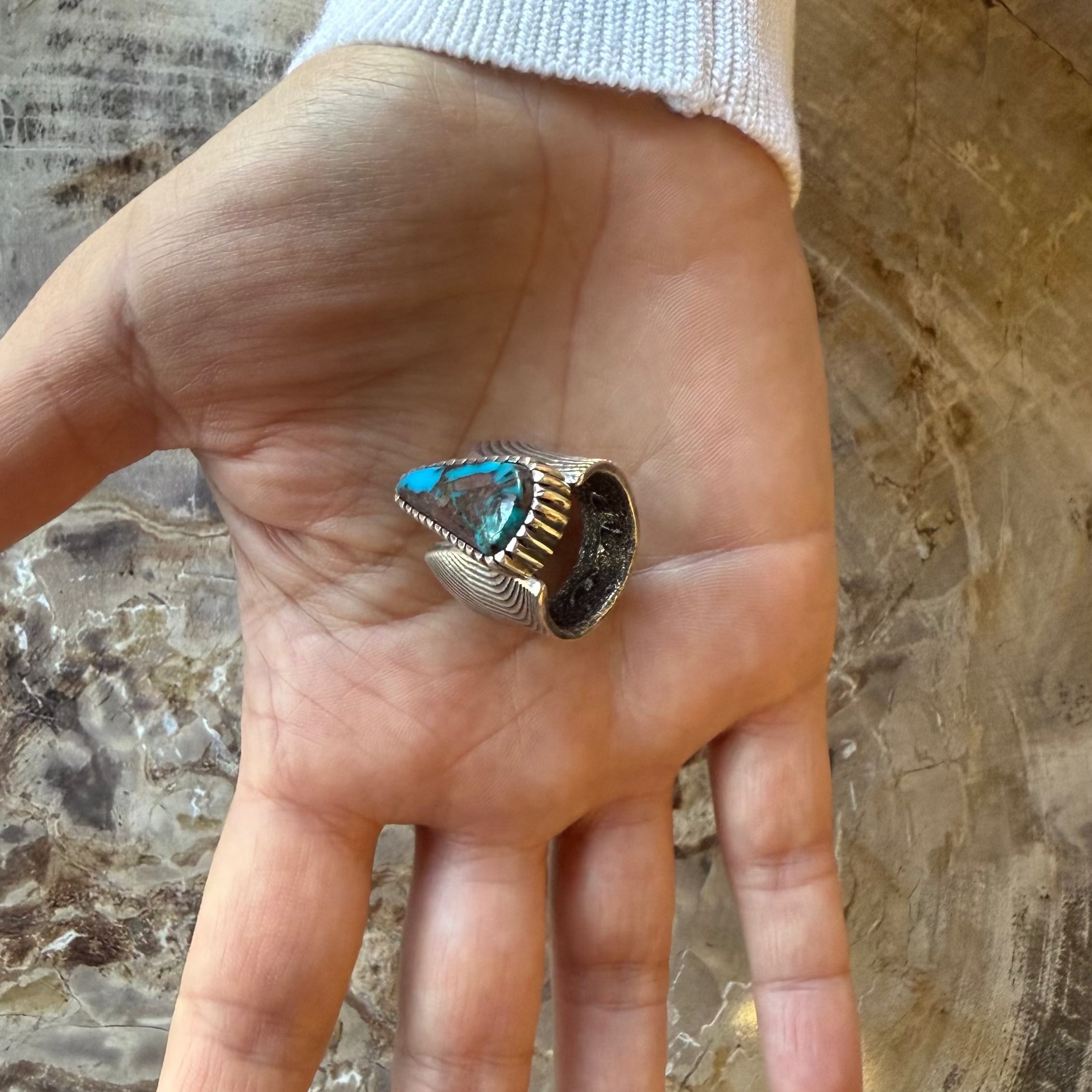 Crafted by Navajo artist Bruce Lane, this ring reflects his mastery of traditional cuttlebone casting. Bruce is known throughout the Navajo Nation for his ability to bring organic texture and refined form together through both cuttlebone and tufa stone techniques.