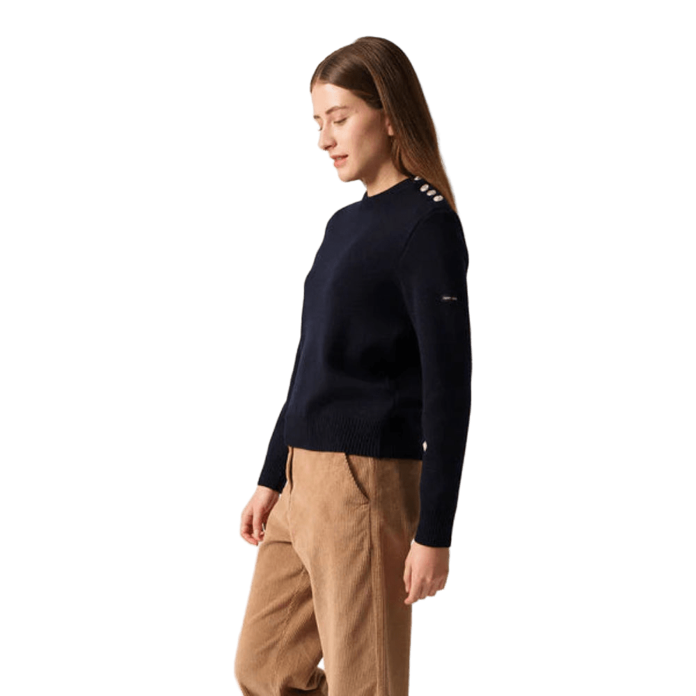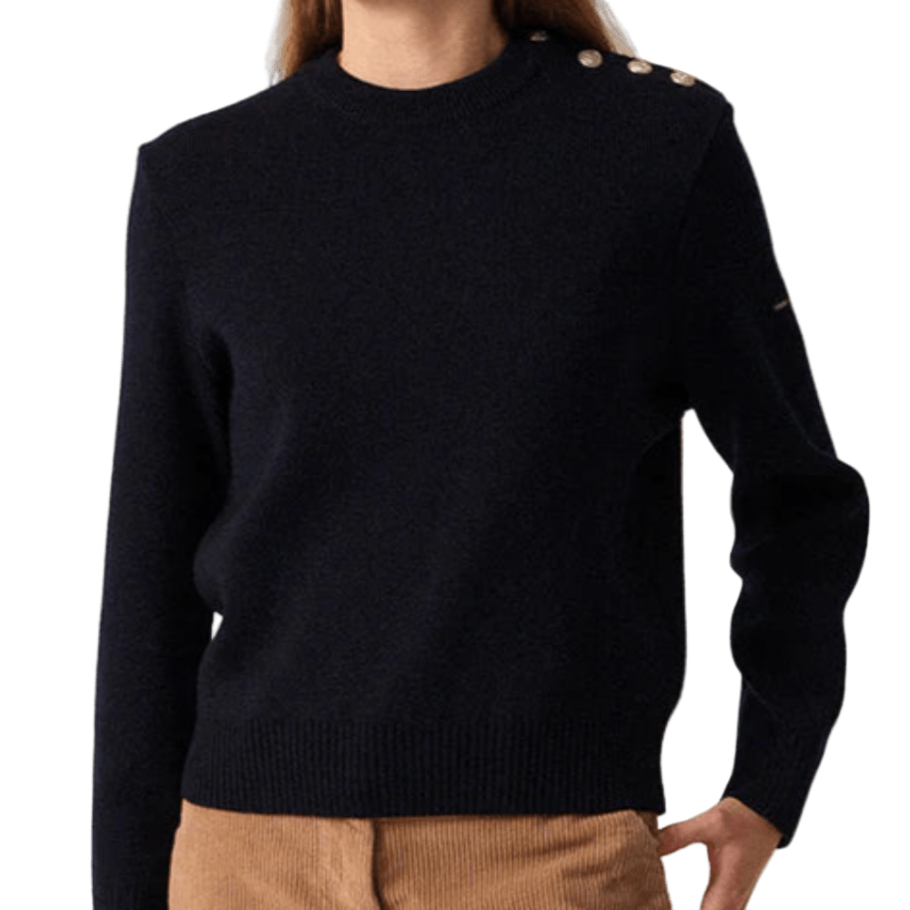 Inspired by ocean spray and the gentle chill of autumn mornings, the Cancale sailor jumper comes in a feminine version. Round neck, long sleeves, comfort fit. Made with the iconic yarn of our Marée model and knitted in 1x1 rib for warmth and comfort. It also features 4 silver metal anchor buttons delicately placed on the left shoulder, offering a unique maritime touch to the piece.