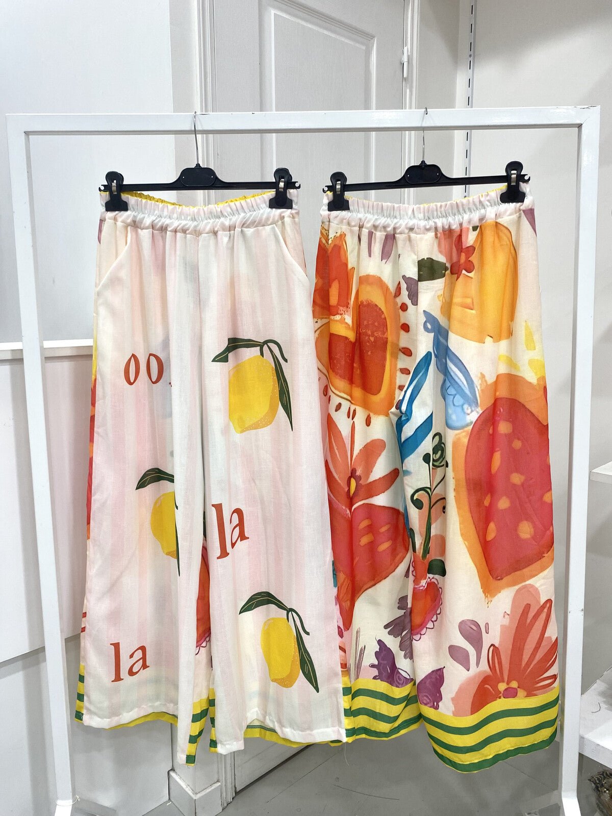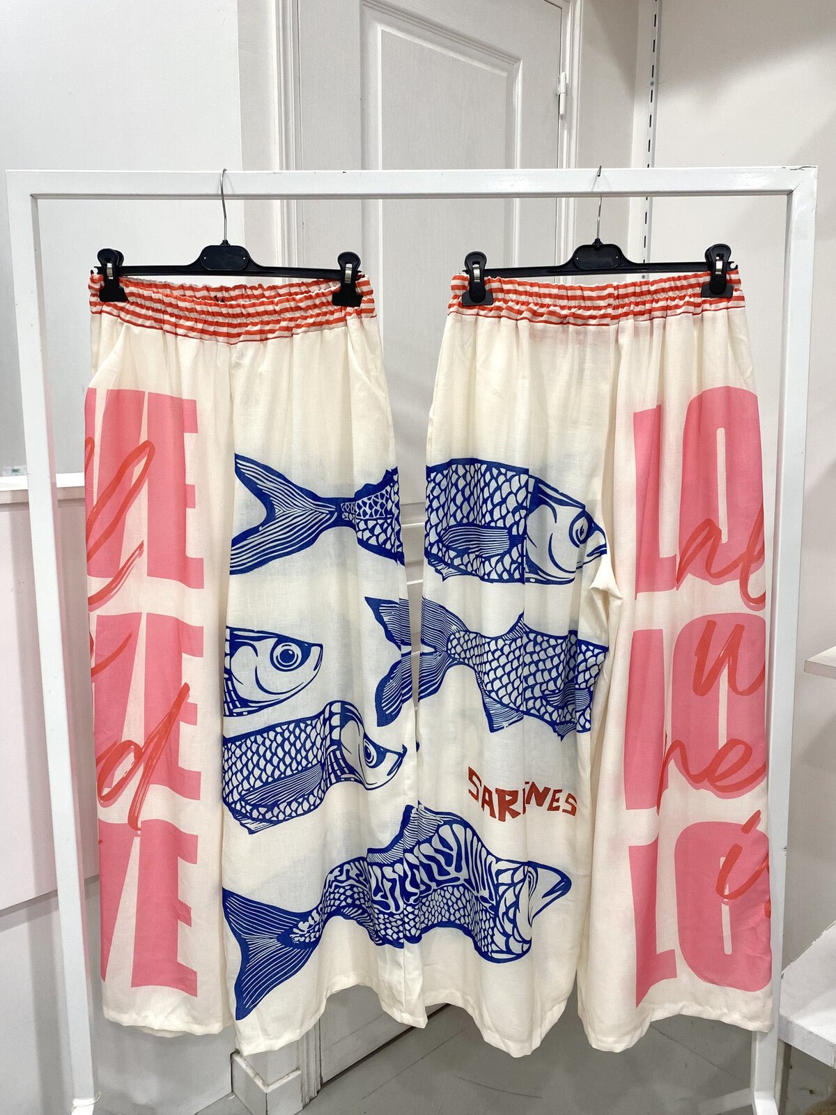 Fluid flowing pants with fun patterns printed on linen-blend pants with an elastic waist.