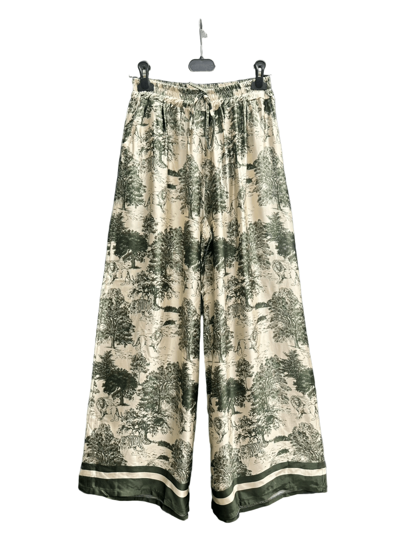 One size, casual pants with a Toile de Jouy pattern depicting African wildlife and a safari theme. One size fits most, elastic drawstring waistband, and front pockets.